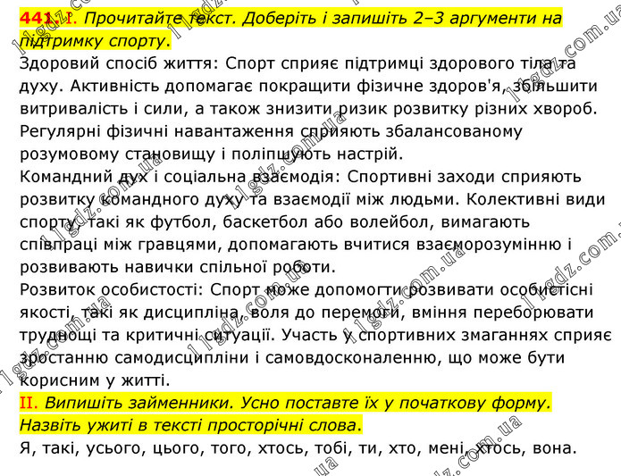 І. Прочитайте текст. Доберіть і запишіть 2–3 аргументи на підтримку спорту. Здоровий спосіб життя: Спорт сприяє підтримці здорового тіла та духу. Активність допомагає покращити фізичне здоров'я, збільшити витривалість і сили, а також знизити ризик розвитку різних хвороб. Регулярні фізичні навантаження сприяють збалансованому розумовому становищу і поліпшують настрій. Командний дух і соціальна взаємодія: Спортивні заходи сприяють розвитку командного духу та взаємодії між людьми. Колективні види спорту, такі як футбол, баскетбол або волейбол, вимагають співпраці між гравцями, допомагають вчитися взаєморозумінню і розвивають навички спільної роботи. Розвиток особистості: Спорт може допомогти розвивати особистісні якості, такі як дисципліна, воля до перемоги, вміння переборювати труднощі та критичні ситуації. Участь у спортивних змаганнях сприяє зростанню самодисципліни і самовдосконаленню, що може бути корисним у житті. ІІ. Випишіть займенники. Усно поставте їх у початкову форму. Назвіть ужиті в тексті просторічні слова. Я, такі, усього, цього, того, хтось, тобі, ти, хто, мені, хтось, вона.