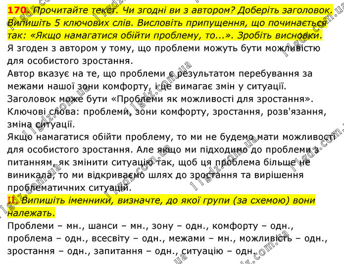 Прочитайте текст. Чи згодні ви з автором? Доберіть заголовок. Випишіть 5 ключових слів. Висловіть припущення, що починається так: «Якщо намагатися обійти проблему, то...». Зробіть висновки. Я згоден з автором у тому, що проблеми можуть бути можливістю для особистого зростання. Автор вказує на те, що проблеми є результатом перебування за межами нашої зони комфорту, і це вимагає змін у ситуації. Заголовок може бути «Проблеми як можливості для зростання». Ключові слова: проблеми, зони комфорту, зростання, розв'язання, зміна ситуації. Якщо намагатися обійти проблему, то ми не будемо мати можливості для особистого зростання. Але якщо ми підходимо до проблеми з питанням, як змінити ситуацію так, щоб ця проблема більше не виникала, то ми відкриваємо шлях до зростання та вирішення проблематичних ситуацій. ІІ. Випишіть іменники, визначте, до якої групи (за схемою) вони належать. Проблеми – мн., шанси – мн., зону – одн., комфорту – одн., проблема – одн., всесвіту – одн., межами – мн., можливість – одн., зростання – одн., запитання – одн., ситуацію – одн.