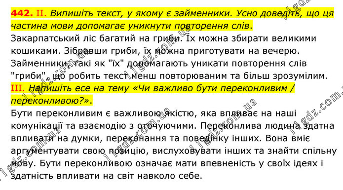 ІІ. Випишіть текст, у якому є займенники. Усно доведіть, що ця частина мови допомагає уникнути повторення слів. Закарпатський ліс багатий на гриби. Їх можна збирати великими кошиками. Зібравши гриби, їх можна приготувати на вечерю. Займенники, такі як "їх" допомагають уникати повторення слів "гриби", що робить текст менш повторюваним та більш зрозумілим. ІІІ. Напишіть есе на тему «Чи важливо бути переконливим / переконливою?». Бути переконливим є важливою якістю, яка впливає на наші комунікації та взаємодію з оточуючими. Переконлива людина здатна впливати на думки, переконання та поведінку інших. Вона вміє аргументувати свою позицію, вислуховувати інших та знайти спільну мову. Бути переконливою означає мати впевненість у своїх ідеях і здатність впливати на світ навколо себе.