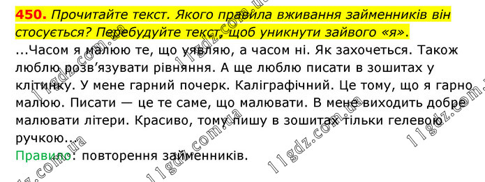 Прочитайте текст. Якого правила вживання займенників він стосується? Перебудуйте текст, щоб уникнути зайвого «я». ...Часом я малюю те, що уявляю, а часом ні. Як захочеться. Також люблю розв’язувати рівняння. А ще люблю писати в зошитах у клітинку. У мене гарний почерк. Каліграфічний. Це тому, що я гарно малюю. Писати — це те саме, що малювати. В мене виходить добре малювати літери. Красиво, тому пишу в зошитах тільки гелевою ручкою... Правило: повторення займенників.