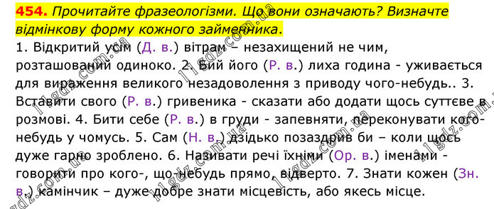 Прочитайте фразеологізми. Що вони означають? Визначте відмінкову форму кожного займенника. 1. Відкритий усім (Д. в.) вітрам – незахищений не чим, розташований одиноко. 2. Бий його (Р. в.) лиха година - уживається для вираження великого незадоволення з приводу чого-небудь.. 3. Вставити свого (Р. в.) гривеника - сказати або додати щось суттєве в розмові. 4. Бити себе (Р. в.) в груди - запевняти, переконувати кого-небудь у чомусь. 5. Сам (Н. в.) дзідько позаздрив би – коли щось дуже гарно зроблено. 6. Називати речі їхніми (Ор. в.) іменами - говорити про кого-, що-небудь прямо, відверто. 7. Знати кожен (Зн. в.) камінчик – дуже добре знати місцевість, або якесь місце.