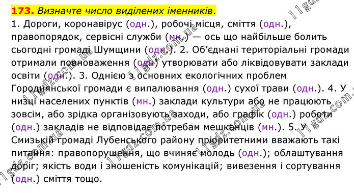 Визначте число виділених іменників. 1. Дороги, коронавірус (одн.), робочі місця, сміття (одн.), правопорядок, сервісні служби (мн.) — ось що найбільше болить сьогодні громаді Шумщини (одн.). 2. Об’єднані територіальні громади отримали повноваження (одн) утворювати або ліквідовувати заклади освіти (одн.). 3. Однією з основних екологічних проблем Городнянської громади є випалювання (одн.) сухої трави (одн.). 4. У низці населених пунктів (мн.) заклади культури або не працюють зовсім, або зрідка організовують заходи, або графік (одн.) роботи (одн.) закладів не відповідає потребам мешканців (мн.). 5. У Смизькій громаді Лубенського району пріоритетними вважають такі питання: правопорушення, що вчиняє молодь (одн.); облаштування доріг; якість води і зношеність комунікацій; вивезення і сортування (одн.) сміття тощо.