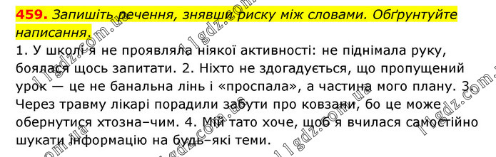 Запишіть речення, знявши риску між словами. Обґрунтуйте написання. 1. У школі я не проявляла ніякої активності: не піднімала руку, боялася щось запитати. 2. Ніхто не здогадується, що пропущений урок — це не банальна лінь і «проспала», а частина мого плану. 3. Через травму лікарі порадили забути про ковзани, бо це може обернутися хтозна–чим. 4. Мій тато хоче, щоб я вчилася самостійно шукати інформацію на будь–які теми.