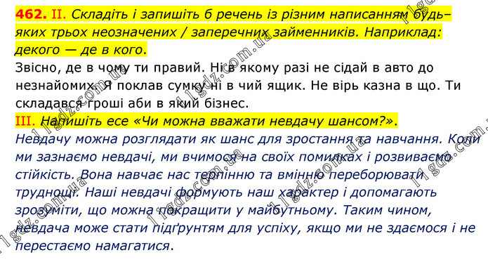 ІІ. Складіть і запишіть б речень із різним написанням будь–яких трьох неозначених / заперечних займенників. Наприклад: декого — де в кого. Звісно, де в чому ти правий. Ні в якому разі не сідай в авто до незнайомих. Я поклав сумку ні в чий ящик. Не вірь казна в що. Ти складався гроші аби в який бізнес. ІІІ. Напишіть есе «Чи можна вважати невдачу шансом?». Невдачу можна розглядати як шанс для зростання та навчання. Коли ми зазнаємо невдачі, ми вчимося на своїх помилках і розвиваємо стійкість. Вона навчає нас терпінню та вмінню переборювати труднощі. Наші невдачі формують наш характер і допомагають зрозуміти, що можна покращити у майбутньому. Таким чином, невдача може стати підґрунтям для успіху, якщо ми не здаємося і не перестаємо намагатися.