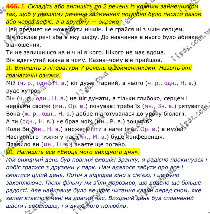 І. Складіть або випишіть по 2 речень із кожним займенником так, щоб у першому реченні займенник потрібно було писати разом або через дефіс, а в другому — окремо. Цей предмет не може бути нічиїм. Не грайся ні з чиїм серцем. Він поклав речі аби в яку шафу. До навчання в нього було абияке відношення. Ти не залишишся на ніч ні в кого. Нікого не має вдома. Він вдягнутий казна в чому. Казна–чому він прийшов. ІІ. Випишіть з літератури 7 речень із займенниками. Назвіть їхні граматичні ознаки. Мій (ч. р., одн., Н. в.) кіт дуже гарний, в нього (ч. р., одн., Н. в.) руде хутро. Він (ч. р., одн., Н. в.) не міг думати, а тільки глибоко, серцем і нервами своїми (мн., Ор. в.) почував: треба їх (мн., Зн. в.) рятувати. Вона (ж. р., одн., Н. в.) добре підготувалася до уроку біології. А ти (одн., Н. в.) не брав моїх (мн., Р. в.) зошитів? Коли Ви (мн., Н. в.) зможете піти з нами (мн., Ор. в.) в музей? Наступного тижня у нас (мн., М. в.) буде конференція. Правило ви (мн., Н. в.) знаєте ще погано. ІІІ. Напишіть есе «Емоції мого вихідного дня». Мій вихідний день був повний емоцій! Зранку, я радісно прокинувся і побіг гратися з друзями у парк. Нам вдалося забути про все і сміятися цілий день. Потім я відвідав кіно з сім'єю, і це було захоплююче. Після фільму ми з'їли морозиво, що додало ще більше радості. Але найкраще було вечірнє читання казки перед сном, яке запам'ятається мені на довгий час. Вихідний день був сповнений щастя і веселощів, і я дуже його полюбив.
