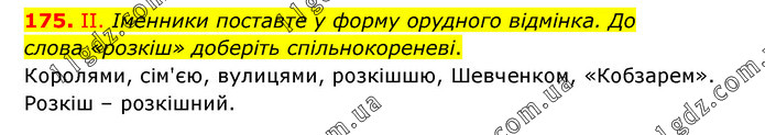 ІІ. Іменники поставте у форму орудного відмінка. До слова «розкіш» доберіть спільнокореневі. Королями, сім'єю, вулицями, розкішшю, Шевченком, «Кобзарем». Розкіш – розкішний.