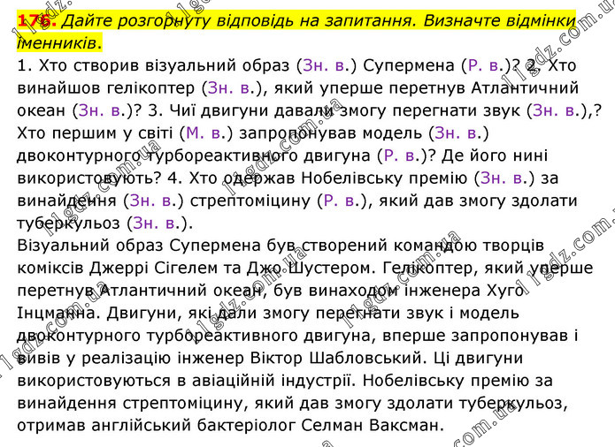 Дайте розгорнуту відповідь на запитання. Визначте відмінки іменників. 1. Хто створив візуальний образ (Зн. в.) Супермена (Р. в.)? 2. Хто винайшов гелікоптер (Зн. в.), який уперше перетнув Атлантичний океан (Зн. в.)? 3. Чиї двигуни давали змогу перегнати звук (Зн. в.),? Хто першим у світі (М. в.) запропонував модель (Зн. в.) двоконтурного турбореактивного двигуна (Р. в.)? Де його нині використовують? 4. Хто одержав Нобелівську премію (Зн. в.) за винайдення (Зн. в.) стрептоміцину (Р. в.), який дав змогу здолати туберкульоз (Зн. в.). Візуальний образ Супермена був створений командою творців коміксів Джеррі Сігелем та Джо Шустером. Гелікоптер, який уперше перетнув Атлантичний океан, був винаходом інженера Хуго Інцманна. Двигуни, які дали змогу перегнати звук і модель двоконтурного турбореактивного двигуна, вперше запропонував і вивів у реалізацію інженер Віктор Шабловський. Ці двигуни використовуються в авіаційній індустрії. Нобелівську премію за винайдення стрептоміцину, який дав змогу здолати туберкульоз, отримав англійський бактеріолог Селман Ваксман.