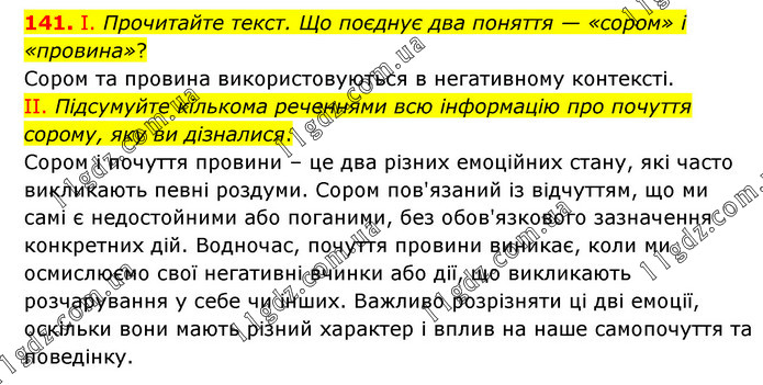 І. Прочитайте текст. Що поєднує два поняття — «сором» і «провина»? Сором та провина використовуються в негативному контексті. ІІ. Підсумуйте кількома реченнями всю інформацію про почуття сорому, яку ви дізналися. Сором і почуття провини – це два різних емоційних стану, які часто викликають певні роздуми. Сором пов'язаний із відчуттям, що ми самі є недостойними або поганими, без обов'язкового зазначення конкретних дій. Водночас, почуття провини виникає, коли ми осмислюємо свої негативні вчинки або дії, що викликають розчарування у себе чи інших. Важливо розрізняти ці дві емоції, оскільки вони мають різний характер і вплив на наше самопочуття та поведінку.
