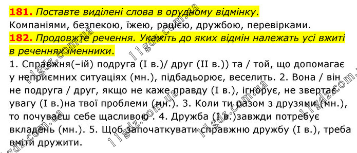 181. Поставте виділені слова в орудному відмінку. Компаніями, безпекою, їжею, рацією, дружбою, перевірками. 182. Продовжте речення. Укажіть до яких відмін належать усі вжиті в реченнях іменники. 1. Справжня(–ій) подруга (І в.)/ друг (ІІ в.)) та / той, що допомагає у неприємних ситуаціях (мн.), підбадьорює, веселить. 2. Вона / він не подруга / друг, якщо не каже правду (І в.), ігнорує, не звертає увагу (І в.)на твої проблеми (мн.). 3. Коли ти разом з друзями (мн.), то почуваєш себе щасливою . 4. Дружба (І в.)завжди потребує вкладень (мн.). 5. Щоб започаткувати справжню дружбу (І в.), треба вміти дружити.