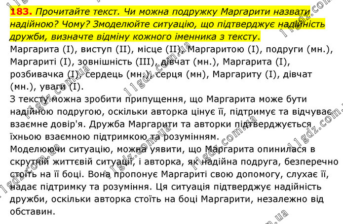 Прочитайте текст. Чи можна подружку Маргарити назвати надійною? Чому? Змоделюйте ситуацію, що підтверджує надійність дружби, визначте відміну кожного іменника з тексту. Маргарита (І), виступ (ІІ), місце (ІІ), Маргаритою (І), подруги (мн.), Маргариті (І), зовнішність (ІІІ), дівчат (мн.), Маргарита (І), розбивачка (І), сердець (мн.), серця (мн), Маргариту (І), дівчат (мн.), уваги (І). З тексту можна зробити припущення, що Маргарита може бути надійною подругою, оскільки авторка цінує її, підтримує та відчуває взаємне довір'я. Дружба Маргарити та авторки підтверджується їхньою взаємною підтримкою та розумінням. Моделюючи ситуацію, можна уявити, що Маргарита опинилася в скрутній життєвій ситуації, і авторка, як надійна подруга, безперечно стоїть на її боці. Вона пропонує Маргариті свою допомогу, слухає її, надає підтримку та розуміння. Ця ситуація підтверджує надійність дружби, оскільки авторка стоїть на боці Маргарити, незалежно від обставин.
