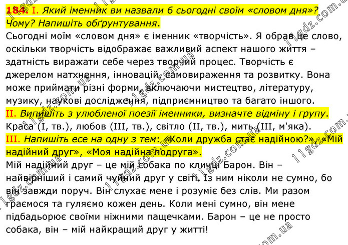 І. Який іменник ви назвали 6 сьогодні своїм «словом дня»? Чому? Напишіть обґрунтування. Сьогодні моїм «словом дня» є іменник «творчість». Я обрав це слово, оскільки творчість відображає важливий аспект нашого життя – здатність виражати себе через творчий процес. Творчість є джерелом натхнення, інновацій, самовираження та розвитку. Вона може приймати різні форми, включаючи мистецтво, літературу, музику, наукові дослідження, підприємництво та багато іншого. ІІ. Випишіть з улюбленої поезії іменники, визначте відміну і групу. Краса (І, тв.), любов (ІІІ, тв.), світло (ІІ, тв.), мить (ІІІ, м'яка). ІІІ. Напишіть есе на одну з тем: «Коли дружба стає надійною?», «Мій надійний друг», «Моя надійна подруга». Мій надійний друг – це мій собака по кличці Барон. Він – найвірніший і самий чуйний друг у світі. Із ним ніколи не сумно, бо він завжди поруч. Він слухає мене і розуміє без слів. Ми разом граємося та гуляємо кожен день. Коли мені сумно, він мене підбадьорює своїми ніжними пащечками. Барон – це не просто собака, він – мій найкращий друг у житті!