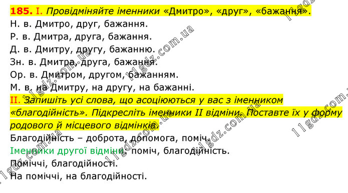 І. Провідміняйте іменники «Дмитро», «друг», «бажання». Н. в. Дмитро, друг, бажання. Р. в. Дмитра, друга, бажання. Д. в. Дмитру, другу, бажанню. Зн. в. Дмитра, друга, бажання. Ор. в. Дмитром, другом, бажанням. М. в. на Дмитру, на другу, на бажанні. ІІ. Запишіть усі слова, що асоціюються у вас з іменником «благодійність». Підкресліть іменники II відміни. Поставте їх у форму родового й місцевого відмінків. Благодійність – доброта, допомога, поміч. Іменники другої відміни: поміч, благодійність. Поміччі, благодійності. На поміччі, на благодійності.