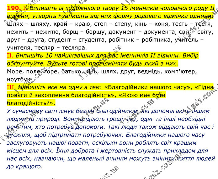 І. Випишіть із художнього твору 15 іменників чоловічого роду II відміни, утворіть і запишіть від них форму родового відмінка однини. Шлях – шляху, край – краю, степ – степу, кінь – коня, тесть – тестя, нежить – нежитю, борщ – борщу, документ – документа, світ – світу, друг – друга, студент – студента, робітник – робітника, учитель – учителя, тесляр – тесляра. ІІ. Випишіть 10 найцікавіших для вас іменників II відміни. Вибір обґрунтуйте. Будьте готові провідміняти будь який з них. Море, поле, горе, батько, кінь, шлях, друг, ведмідь, комп'ютер, ноутбук ІІІ. Напишіть есе на одну з тем: «Благодійники нашого часу», «Гідна поваги й захоплення благодійність», «Якою має бути благодійність?». У сучасному світі існує безліч благодійників, які допомагають іншим людям та природі. Вони видають гроші, їжу, одяг та інші необхідні речі тим, хто потребує допомоги. Такі люди також віддають свій час і зусилля, щоб підтримати потребуючих. Благодійники нашого часу заслуговують нашої поваги, оскільки вони роблять світ кращим місцем для всіх. Їхня доброта і жертовність служать прикладом для нас всіх, навчаючи, що маленькі вчинки можуть змінити життя людей до кращого.