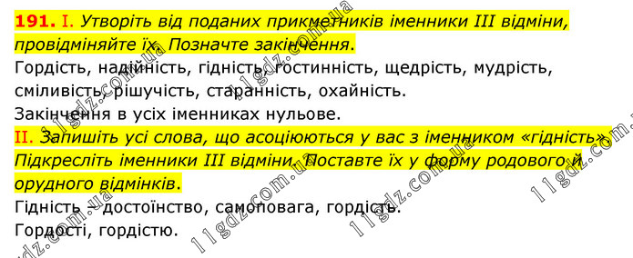 І. Утворіть від поданих прикметників іменники III відміни, провідміняйте їх. Позначте закінчення. Гордість, надійність, гідність, гостинність, щедрість, мудрість, сміливість, рішучість, старанність, охайність. Закінчення в усіх іменниках нульове. ІІ. Запишіть усі слова, що асоціюються у вас з іменником «гідність». Підкресліть іменники III відміни. Поставте їх у форму родового й орудного відмінків. Гідність – достоїнство, самоповага, гордість. Гордості, гордістю.
