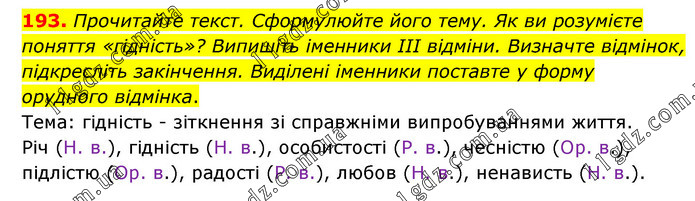Прочитайте текст. Сформулюйте його тему. Як ви розумієте поняття «гідність»? Випишіть іменники III відміни. Визначте відмінок, підкресліть закінчення. Виділені іменники поставте у форму орудного відмінка. Тема: гідність - зіткнення зі справжніми випробуваннями життя. Річ (Н. в.), гідність (Н. в.), особистості (Р. в.), чесністю (Ор. в.), підлістю (Ор. в.), радості (Р. в.), любов (Н. в.), ненависть (Н. в.).