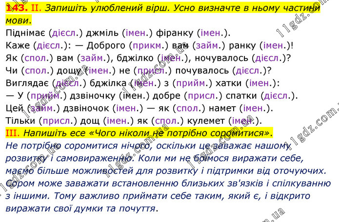 ІІ. Запишіть улюблений вірш. Усно визначте в ньому частини мови. Піднімає (дієсл.) джміль (імен.) фіранку (імен.). Каже (дієсл.): — Доброго (прикм.) вам (займ.) ранку (імен.)! Як (спол.) вам (займ.), бджілко (імен.), ночувалось (дієсл.)? Чи (спол.) дощу (імен.) не (присл.) почувалось (дієсл.)? Виглядає (дієсл.) бджілка (імен.) з (прийм.) хатки (імен.): — У (прийм.) дзвіночку (імен.) добре (присл.) спатки (дієсл.). Цей (займ.) дзвіночок (імен.) — як (спол.) намет (імен.). Тільки (присл.) дощ (імен.) як (спол.) кулемет (імен.). ІІІ. Напишіть есе «Чого ніколи не потрібно соромитися». Не потрібно соромитися нічого, оскільки це заважає нашому розвитку і самовираженню. Коли ми не боїмося виражати себе, маємо більше можливостей для розвитку і підтримки від оточуючих. Сором може заважати встановленню близьких зв'язків і спілкуванню з іншими. Тому важливо приймати себе таким, який є, і відкрито виражати свої думки та почуття.