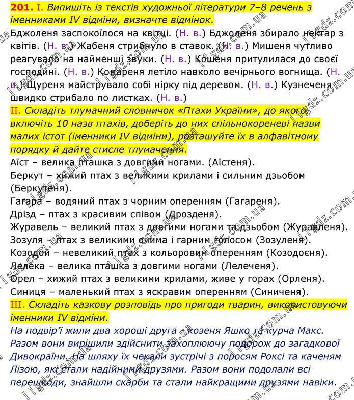 І. Випишіть із текстів художньої літератури 7–8 речень з іменниками IV відміни, визначте відмінок. Бджоленя заспокоїлося на квітці. (Н. в.) Бджоленя збирало нектар з квітів. (Н. в.) Жабеня стрибнуло в ставок. (Н. в.) Мишеня чутливо реагувало на найменші звуки. (Н. в.) Кошеня притулилася до своєї господині. (Н. в.) Комареня летіло навколо вечірнього вогнища. (Н. в.) Щуреня майструвало собі нірку під деревом. (Н. в.) Кузнеченя швидко стрибало по листках. (Н. в.) ІІ. Складіть тлумачний словничок «Птахи України», до якого включіть 10 назв птахів, доберіть до них спільнокореневі назви малих істот (іменники IV відміни), розташуйте їх в алфавітному порядку й дайте стисле тлумачення. Аїст – велика пташка з довгими ногами. (Аїстеня). Беркут – хижий птах з великими крилами і сильним дзьобом (Беркутеня). Гагара – водяний птах з чорним оперенням (Гагареня). Дрізд – птах з красивим співом (Дрозденя). Журавель – великий птах з довгими ногами та дзьобом (Журавленя). Зозуля – птах з великими очима і гарним голосом (Зозуленя). Козодой – невеликий птах з кольоровим оперенням (Козодоєня). Лелека – велика пташка з довгими ногами (Лелеченя). Орел – хижий птах з великими крилами, живе у горах (Орленя). Синиця – маленький птах з яскравим оперенням (Синиченя). ІІІ. Складіть казкову розповідь про пригоди тварин, використовуючи іменники IV відміни. На подвір’ї жили два хороші друга - козеня Яшко та курча Макс. Разом вони вирішили здійснити захоплюючу подорож до загадкової Дивокраїни. На шляху їх чекали зустрічі з поросям Роксі та каченям Лізою, які стали надійними друзями. Разом вони подолали всі перешкоди, знайшли скарби та стали найкращими друзями навіки.