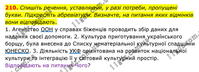 Спишіть речення, уставляючи, у разі потреби, пропущені букви. Підкресліть абревіатури. Визначте, на питання яких відмінків вони відповідають. 1. Агентство ООН у справах біженців проводить збір даних для надання своєї допомоги. 2. Культура приготування українського борщу, була внесена до Списку нематеріальної культурної спадщини ЮНЕСКО. 3. Діяльність УКФ орієнтована на розвиток національної культури та інтеграцію її у світовий культурний простір. Відповідають на питання Чого?