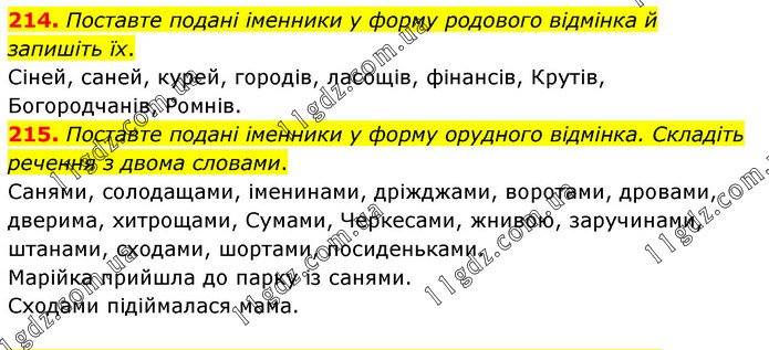 214. Поставте подані іменники у форму родового відмінка й запишіть їх. Сіней, саней, курей, городів, ласощів, фінансів, Крутів, Богородчанів, Ромнів. 215. Поставте подані іменники у форму орудного відмінка. Складіть речення з двома словами. Санями, солодащами, іменинами, дріжджами, воротами, дровами, дверима, хитрощами, Сумами, Черкесами, жнивою, заручинами, штанами, сходами, шортами, посиденьками. Марійка прийшла до парку із санями. Сходами підіймалася мама.