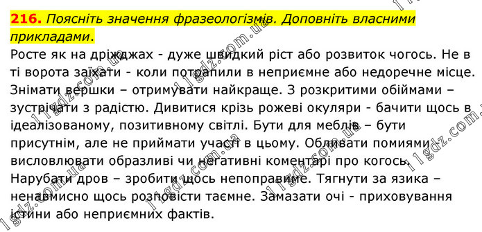 Поясніть значення фразеологізмів. Доповніть власними прикладами. Росте як на дріжджах - дуже швидкий ріст або розвиток чогось. Не в ті ворота заїхати - коли потрапили в неприємне або недоречне місце. Знімати вершки – отримувати найкраще. З розкритими обіймами – зустрічати з радістю. Дивитися крізь рожеві окуляри - бачити щось в ідеалізованому, позитивному світлі. Бути для меблів – бути присутнім, але не приймати участі в цьому. Обливати помиями - висловлювати образливі чи негативні коментарі про когось. Нарубати дров – зробити щось непоправиме. Тягнути за язика – ненавмисно щось розповісти таємне. Замазати очі - приховування істини або неприємних фактів.