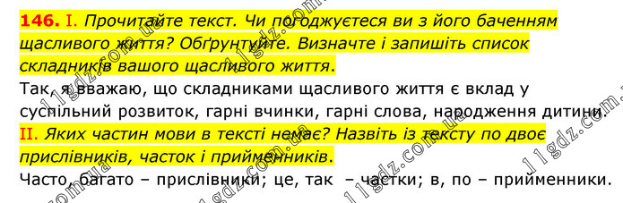 І. Прочитайте текст. Чи погоджуєтеся ви з його баченням щасливого життя? Обґрунтуйте. Визначте і запишіть список складників вашого щасливого життя. Так, я вважаю, що складниками щасливого життя є вклад у суспільний розвиток, гарні вчинки, гарні слова, народження дитини. ІІ. Яких частин мови в тексті немає? Назвіть із тексту по двоє прислівників, часток і прийменників. Часто, багато – прислівники; це, так – частки; в, по – прийменники.