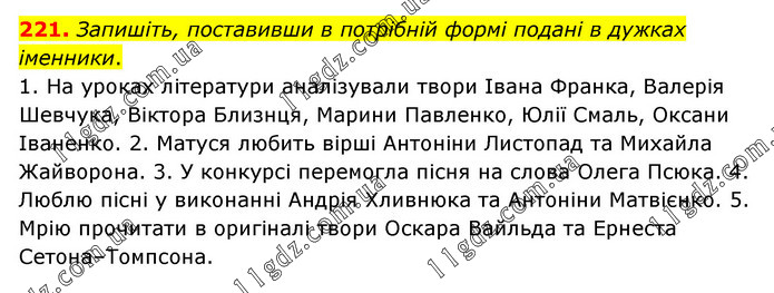 Запишіть, поставивши в потрібній формі подані в дужках іменники. 1. На уроках літератури аналізували твори Івана Франка, Валерія Шевчука, Віктора Близнця, Марини Павленко, Юлії Смаль, Оксани Іваненко. 2. Матуся любить вірші Антоніни Листопад та Михайла Жайворона. 3. У конкурсі перемогла пісня на слова Олега Псюка. 4. Люблю пісні у виконанні Андрія Хливнюка та Антоніни Матвієнко. 5. Мрію прочитати в оригіналі твори Оскара Вайльда та Ернеста Сетона–Томпсона.