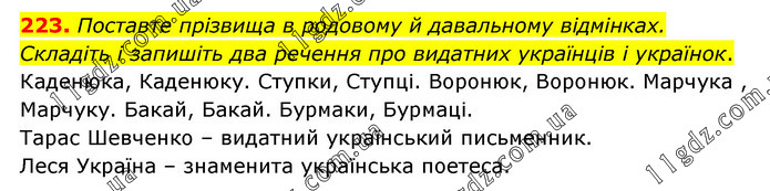 Поставте прізвища в родовому й давальному відмінках. Складіть і запишіть два речення про видатних українців і українок. Каденюка, Каденюку. Ступки, Ступці. Воронюк, Воронюк. Марчука , Марчуку. Бакай, Бакай. Бурмаки, Бурмаці. Тарас Шевченко – видатний український письменник. Леся Україна – знаменита українська поетеса.