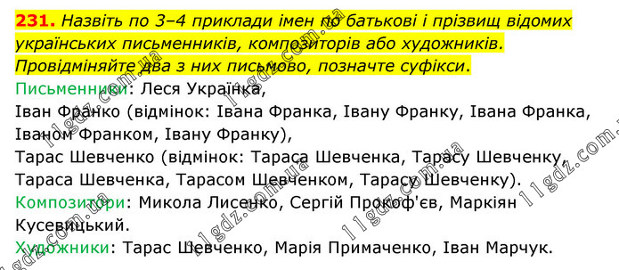 Назвіть по 3–4 приклади імен по батькові і прізвищ відомих українських письменників, композиторів або художників. Провідміняйте два з них письмово, позначте суфікси. Письменники: Леся Українка, Іван Франко (відмінок: Івана Франка, Івану Франку, Івана Франка, Іваном Франком, Івану Франку), Тарас Шевченко (відмінок: Тараса Шевченка, Тарасу Шевченку, Тараса Шевченка, Тарасом Шевченком, Тарасу Шевченку). Композитори: Микола Лисенко, Сергій Прокоф'єв, Маркіян Кусевицький. Художники: Тарас Шевченко, Марія Примаченко, Іван Марчук.