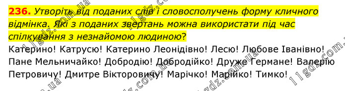 Утворіть від поданих слів і словосполучень форму кличного відмінка. Які з поданих звертань можна використати під час спілкування з незнайомою людиною? Катерино! Катрусю! Катерино Леонідівно! Лесю! Любове Іванівно! Пане Мельничайко! Добродію! Добродійко! Друже Германе! Валерію Петровичу! Дмитре Вікторовичу! Марічко! Марійко! Тимко!