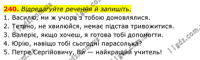 Відредагуйте речення й запишіть. 1. Василю, ми ж учора з тобою домовлялися. 2. Тетяно, не хвилюйся, немає підстав тривожитися. 3. Валеріє, якщо хочеш, я готова тобі допомогти. 4. Юрію, навіщо тобі сьогодні парасолька? 5. Петре Сергійовичу, Ви — найкращий учитель!