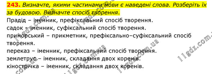 Визначте, якими частинами мови є наведені слова. Розберіть їх за будовою. Визначте спосіб творення. Прадід – іменник, префіксальний спосіб творення. садок – іменник, суфіксальний спосіб творення. приморський – прикметник, префіксально–суфіксальний спосіб творення. переказ – іменник, префіксальний спосіб творення. землетрус – іменник, складання двох коренів. кінострічка – іменник, складання двох коренів.