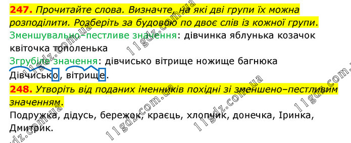 247. Прочитайте слова. Визначте, на які дві групи їх можна розподілити. Розберіть за будовою по двоє слів із кожної групи. Зменшувально–пестливе значення: дівчинка яблунька козачок квіточка тополенька Згрубіле значення: дівчисько вітрище ножище багнюка Дівчисько, вітрище. 248. Утворіть від поданих іменників похідні зі зменшено–пестливим значенням. Подружка, дідусь, бережок, краєць, хлопчик, донечка, Іринка, Дмитрик.
