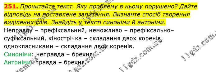 Прочитайте текст. Яку проблему в ньому порушено? Дайте відповідь на поставлене запитання. Визначте спосіб творення виділених слів. Знайдіть у тексті синоніми й антоніми. Неправду – префіксальний, неможливо – префіксально–суфіксальний, кінострічка – складання двох коренів, однокласниками – складання двох коренів. Синоніми: неправда – брехня. Антоніми: правда – брехня.
