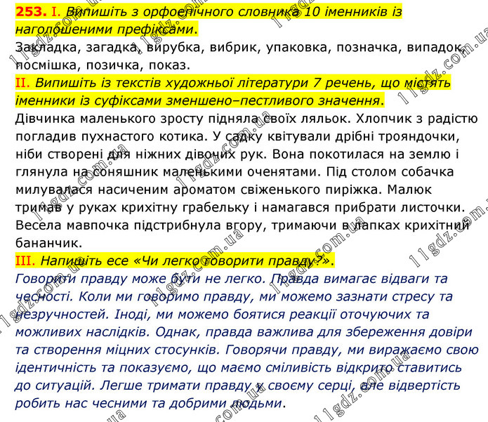 І. Випишіть з орфоепічного словника 10 іменників із наголошеними префіксами. Закладка, загадка, вирубка, вибрик, упаковка, позначка, випадок, посмішка, позичка, показ. ІІ. Випишіть із текстів художньої літератури 7 речень, що містять іменники із суфіксами зменшено–пестливого значення. Дівчинка маленького зросту підняла своїх ляльок. Хлопчик з радістю погладив пухнастого котика. У садку квітували дрібні трояндочки, ніби створені для ніжних дівочих рук. Вона покотилася на землю і глянула на соняшник маленькими оченятами. Під столом собачка милувалася насиченим ароматом свіженького пиріжка. Малюк тримав у руках крихітну грабельку і намагався прибрати листочки. Весела мавпочка підстрибнула вгору, тримаючи в лапках крихітний бананчик. ІІІ. Напишіть есе «Чи легко говорити правду?». Говорити правду може бути не легко. Правда вимагає відваги та чесності. Коли ми говоримо правду, ми можемо зазнати стресу та незручностей. Іноді, ми можемо боятися реакції оточуючих та можливих наслідків. Однак, правда важлива для збереження довіри та створення міцних стосунків. Говорячи правду, ми виражаємо свою ідентичність та показуємо, що маємо сміливість відкрито ставитись до ситуацій. Легше тримати правду у своєму серці, але відвертість робить нас чесними та добрими людьми.