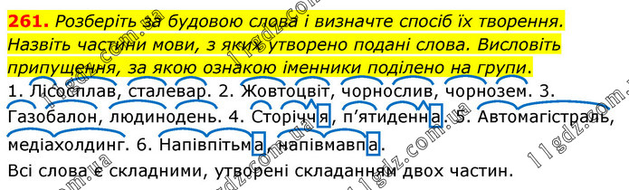 Розберіть за будовою слова і визначте спосіб їх творення. Назвіть частини мови, з яких утворено подані слова. Висловіть припущення, за якою ознакою іменники поділено на групи. 1. Лісосплав, сталевар. 2. Жовтоцвіт, чорнослив, чорнозем. 3. Газобалон, людинодень. 4. Сторіччя, п’ятиденна. 5. Автомагістраль, медіахолдинг. 6. Напівпітьма, напівмавпа. Всі слова є складними, утворені складанням двох частин.