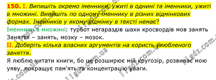 І. Випишіть окремо іменники, ужиті в однині та іменники, ужиті в множині. Випишіть по одному іменнику в різних відмінкових формах. Іменників у якому відмінку в тексті немає? Іменники в множині: турбот негараздів шахи кросвордів мов занять Заняття – занять, мозку – мозок. ІІ. Доберіть кілька власних аргументів на користь улюбленого заняття. Я люблю читати книги, бо це розширює мій кругозір, розвиває мою уяву, покращує пам'ять та концентрацію уваги.