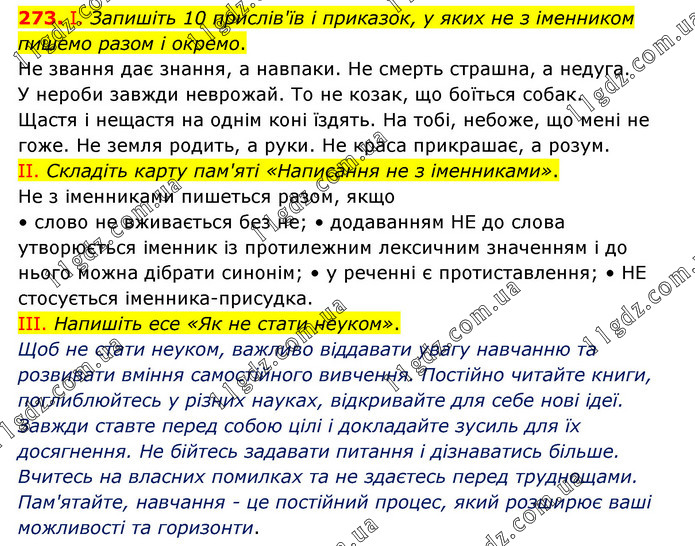 І. Запишіть 10 прислів'їв і приказок, у яких не з іменником пишемо разом і окремо. Не звання дає знання, а навпаки. Не смерть страшна, а недуга. У нероби завжди неврожай. То не козак, що боїться собак. Щастя і нещастя на однім коні їздять. На тобі, небоже, що мені не гоже. Не земля родить, а руки. Не краса прикрашає, а розум. ІІ. Складіть карту пам'яті «Написання не з іменниками». Не з іменниками пишеться разом, якщо • слово не вживається без не; • додаванням НЕ до слова утворюється іменник із протилежним лексичним значенням і до нього можна дібрати синонім; • у реченні є протиставлення; • НЕ стосується іменника-присудка. ІІІ. Напишіть есе «Як не стати неуком». Щоб не стати неуком, важливо віддавати увагу навчанню та розвивати вміння самостійного вивчення. Постійно читайте книги, поглиблюйтесь у різних науках, відкривайте для себе нові ідеї. Завжди ставте перед собою цілі і докладайте зусиль для їх досягнення. Не бійтесь задавати питання і дізнаватись більше. Вчитесь на власних помилках та не здаєтесь перед труднощами. Пам'ятайте, навчання - це постійний процес, який розширює ваші можливості та горизонти.