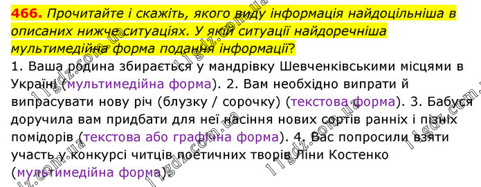 Прочитайте і скажіть, якого виду інформація найдоцільніша в описаних нижче ситуаціях. У якій ситуації найдоречніша мультимедійна форма подання інформації? 1. Ваша родина збирається у мандрівку Шевченківськими місцями в Україні (мультимедійна форма). 2. Вам необхідно випрати й випрасувати нову річ (блузку / сорочку) (текстова форма). 3. Бабуся доручила вам придбати для неї насіння нових сортів ранніх і пізніх помідорів (текстова або графічна форма). 4. Вас попросили взяти участь у конкурсі читців поетичних творів Ліни Костенко (мультимедійна форма).