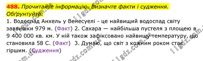 Прочитайте інформацію. Визначте факти і судження. Обґрунтуйте. 1. Водоспад Анхель у Венесуелі - це найвищий водоспад світу заввишки 979 м. (Факт) 2. Сахара — найбільша пустеля з площею в 9 400 000 кв. км. У ній також зафіксовано найвищу температуру, що становила 58 С. (Факт) 3. Думаю, що світ з кожним роком стає гіршим. (Судження)