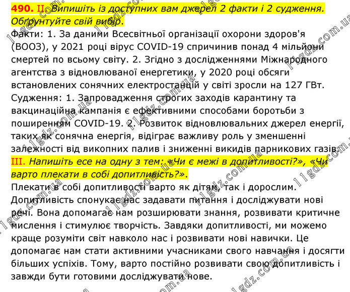 ІІ. Випишіть із доступних вам джерел 2 факти і 2 судження. Обґрунтуйте свій вибір. Факти: 1. За даними Всесвітньої організації охорони здоров'я (ВООЗ), у 2021 році вірус COVID-19 спричинив понад 4 мільйони смертей по всьому світу. 2. Згідно з дослідженнями Міжнародного агентства з відновлюваної енергетики, у 2020 році обсяги встановлених сонячних електростанцій у світі зросли на 127 ГВт. Судження: 1. Запровадження строгих заходів карантину та вакцинаційна кампанія є ефективними способами боротьби з поширенням COVID-19. 2. Розвиток відновлювальних джерел енергії, таких як сонячна енергія, відіграє важливу роль у зменшенні залежності від викопних палив і зниженні викидів парникових газів. ІІІ. Напишіть есе на одну з тем: «Чи є межі в допитливості?», «Чи варто плекати в собі допитливість?». Плекати в собі допитливості варто як дітям, так і дорослим. Допитливість спонукає нас задавати питання і досліджувати нові речі. Вона допомагає нам розширювати знання, розвивати критичне мислення і стимулює творчість. Завдяки допитливості, ми можемо краще розуміти світ навколо нас і розвивати нові навички. Це допомагає нам стати активними учасниками свого навчання і досягти більших успіхів. Тому, варто постійно розвивати свою допитливість і завжди бути готовими досліджувати нове.