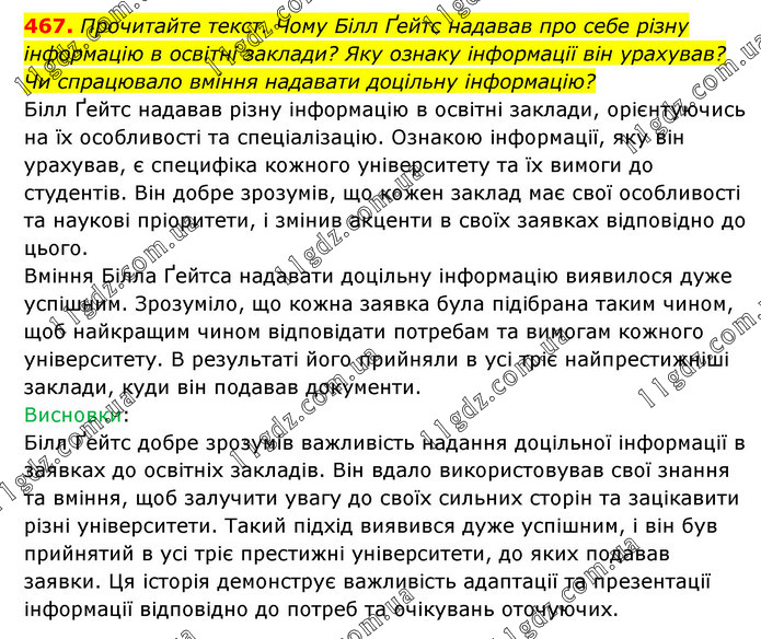 Прочитайте текст. Чому Білл Ґейтс надавав про себе різну інформацію в освітні заклади? Яку ознаку інформації він урахував? Чи спрацювало вміння надавати доцільну інформацію? Білл Ґейтс надавав різну інформацію в освітні заклади, орієнтуючись на їх особливості та спеціалізацію. Ознакою інформації, яку він урахував, є специфіка кожного університету та їх вимоги до студентів. Він добре зрозумів, що кожен заклад має свої особливості та наукові пріоритети, і змінив акценти в своїх заявках відповідно до цього. Вміння Білла Ґейтса надавати доцільну інформацію виявилося дуже успішним. Зрозуміло, що кожна заявка була підібрана таким чином, щоб найкращим чином відповідати потребам та вимогам кожного університету. В результаті його прийняли в усі тріє найпрестижніші заклади, куди він подавав документи. Висновки: Білл Ґейтс добре зрозумів важливість надання доцільної інформації в заявках до освітніх закладів. Він вдало використовував свої знання та вміння, щоб залучити увагу до своїх сильних сторін та зацікавити різні університети. Такий підхід виявився дуже успішним, і він був прийнятий в усі тріє престижні університети, до яких подавав заявки. Ця історія демонструє важливість адаптації та презентації інформації відповідно до потреб та очікувань оточуючих.
