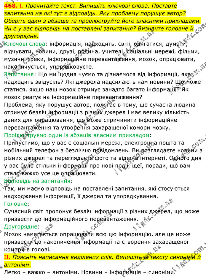 І. Прочитайте текст. Випишіть ключові слова. Поставте запитання на які тут є відповідь. Яку проблему порушує автор? Оберіть один з абзаців та проілюструйте його власними прикладами. Чи є у вас відповідь на поставлені запитання? Визначте головне й другорядне. Ключові слова: інформація, надходить, світі, одягатися, думати, відчувати, новини, друзі, родина, учителі, соціальні мережі, фільми, музичні треки, інформаційне перевантаження, мозок, опрацювати, накопичується, упорядковуєте. Запитання: Що ми щодня чуємо та дізнаємося від інформації, яка надходить звідусіль? Які джерела надсилають нам новини? Що може статися, якщо наш мозок отримує занадто багато інформації? Як мозок реагує на інформаційне перевантаження? Проблема, яку порушує автор, полягає в тому, що сучасна людина отримує безліч інформації з різних джерел і має велику кількість даних для опрацювання, що може спричинити інформаційне перевантаження та утворення захаращеної комори мозку. Проілюструємо один із абзаців власним прикладом: Припустимо, що у вас є соціальні мережі, електронна пошта та мобільний телефон з безліччю повідомлень. Ви розглядаєте новини з різних джерел та переглядаєте фото та відео в інтернеті. Одного дня у вас було стільки інформації про нові події, ідеї, поради, що вам стало важко усе це опрацювати. Відповідь на запитання: Так, ми маємо відповідь на поставлені запитання, які стосуються надходження інформації, її джерел та упорядкування. Головне: Сучасний світ пропонує безліч інформації з різних джерел, що може призвести до інформаційного перевантаження. Другорядне: Мозок намагається опрацювати всю цю інформацію, але це може призвести до накопичення інформації та створення захаращеної комори в голові. ІІ. Поясніть написання виділених слів. Випишіть із тексту синоніми й антоніми. Легко – важко – антоніми. Новини – інформація – синоніми.