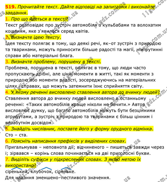 Прочитайте текст. Дайте відповіді на запитання і виконайте завдання. 1. Про що йдеться в тексті? Текст розповідає про зустріч автомобіля з кульбабами та волохатим кошеням, яке з'явилося серед квітів. 2. Визначте ідею тексту. Ідея тексту полягає в тому, що деякі речі, як–от зустріч з природою та тваринами, можуть приносити більше радості та магії, ніж рутинні справи або матеріальні блага. 3. Визначте проблему, порушену в тексті. Проблема, порушена в тексті, полягає в тому, що люди часто пропускають дрібні, але цінні моменти в житті, такі як моменти з природою або моменти радості, зосереджуючись на матеріальних цілях і справах, що можуть затемнити їхнє сприйняття світу. 4. У якому реченні висловлено ставлення автора до вчинку людей? Ставлення автора до вчинку людей висловлено в останньому реченні: «Таких автомобілів краще ніколи не бачити.» Автор висловлює думку, що багато автомобілів можуть бути безцінними атрибутами, а зустріч з природою та тваринами є більш цінним і незабутнім досвідом. 5. Знайдіть числівник, поставте його у форму орудного відмінка. Сто – ста. 6. Поясніть написання префіксів у виділених словах. Пригальмував – неповнота дії; відчиненого – пишеться завжди через і; зірвався – корінь слова починається на дві приголосні букви. 7. Виділіть суфікси у підкреслених словах. З якою метою їх використано? сіренький, клубочок, сіреньке. Для надання зменшено–пестливого значення.