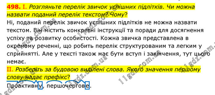 І. Розгляньте перелік звичок успішних підлітків. Чи можна назвати поданий перелік текстом? Чому? Ні, поданий перелік звичок успішних підлітків не можна назвати текстом. Він містить конкретні інструкції та поради для досягнення успіху та розвитку особистості. Кожна звичка представлена в окремому реченні, що робить перелік структурованим та легким у сприйнятті. Але у тексті також має бути вступ і закінчення, тут цього немає. ІІ. Розберіть за будовою виділені слова. Якого значення першому слову надає префікс? Проактивну, першочергове.