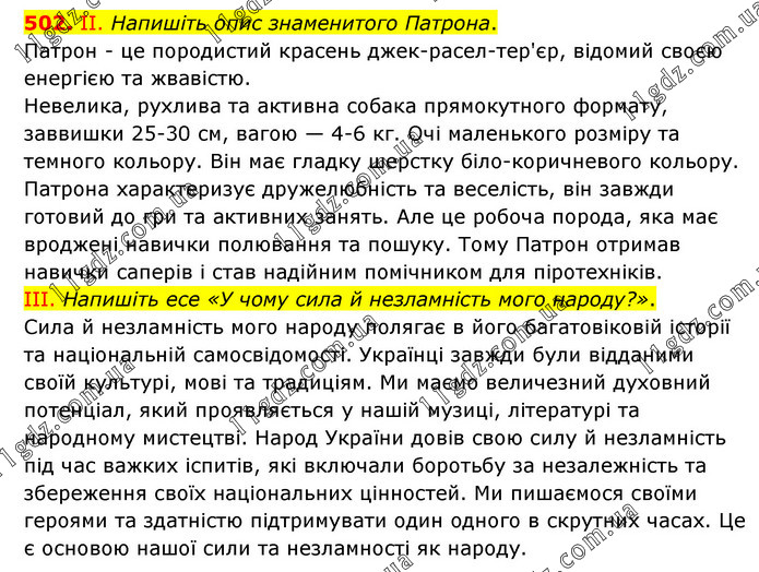 ІІ. Напишіть опис знаменитого Патрона. Патрон - це породистий красень джек-расел-тер'єр, відомий своєю енергією та жвавістю. Невелика, рухлива та активна собака прямокутного формату, заввишки 25-30 см, вагою — 4-6 кг. Очі маленького розміру та темного кольору. Він має гладку шерстку біло-коричневого кольору. Патрона характеризує дружелюбність та веселість, він завжди готовий до гри та активних занять. Але це робоча порода, яка має вроджені навички полювання та пошуку. Тому Патрон отримав навички саперів і став надійним помічником для піротехніків. ІІІ. Напишіть есе «У чому сила й незламність мого народу?». Сила й незламність мого народу полягає в його багатовіковій історії та національній самосвідомості. Українці завжди були відданими своїй культурі, мові та традиціям. Ми маємо величезний духовний потенціал, який проявляється у нашій музиці, літературі та народному мистецтві. Народ України довів свою силу й незламність під час важких іспитів, які включали боротьбу за незалежність та збереження своїх національних цінностей. Ми пишаємося своїми героями та здатністю підтримувати один одного в скрутних часах. Це є основою нашої сили та незламності як народу.