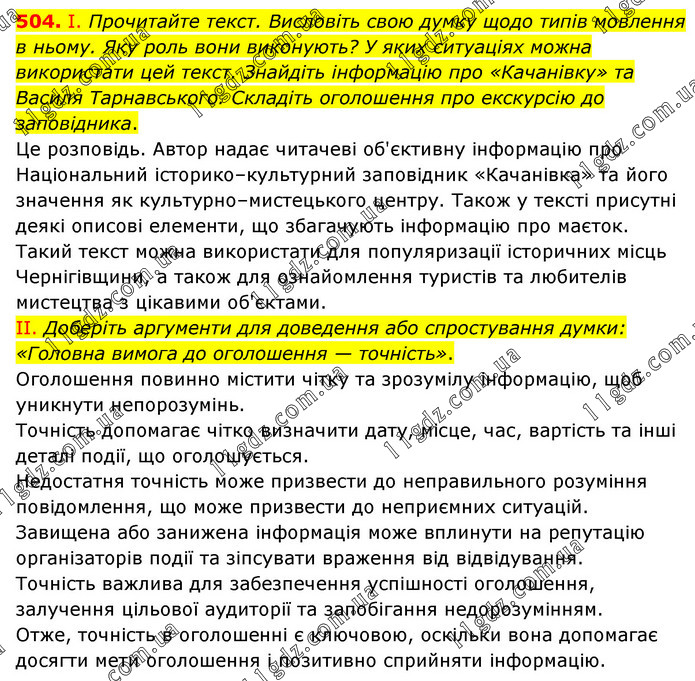 І. Прочитайте текст. Висловіть свою думку щодо типів мовлення в ньому. Яку роль вони виконують? У яких ситуаціях можна використати цей текст. Знайдіть інформацію про «Качанівку» та Василя Тарнавського. Складіть оголошення про екскурсію до заповідника. Це розповідь. Автор надає читачеві об'єктивну інформацію про Національний історико–культурний заповідник «Качанівка» та його значення як культурно–мистецького центру. Також у тексті присутні деякі описові елементи, що збагачують інформацію про маєток. Такий текст можна використати для популяризації історичних місць Чернігівщини, а також для ознайомлення туристів та любителів мистецтва з цікавими об'єктами. ІІ. Доберіть аргументи для доведення або спростування думки: «Головна вимога до оголошення — точність». Оголошення повинно містити чітку та зрозумілу інформацію, щоб уникнути непорозумінь. Точність допомагає чітко визначити дату, місце, час, вартість та інші деталі події, що оголошується. Недостатня точність може призвести до неправильного розуміння повідомлення, що може призвести до неприємних ситуацій. Завищена або занижена інформація може вплинути на репутацію організаторів події та зіпсувати враження від відвідування. Точність важлива для забезпечення успішності оголошення, залучення цільової аудиторії та запобігання недорозумінням. Отже, точність в оголошенні є ключовою, оскільки вона допомагає досягти мети оголошення і позитивно сприйняти інформацію.