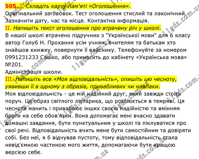 І. Складіть карту пам'яті «Оголошення». Оригінальний заголовок. Тест оголошення стислий та лаконічний. Зазначити дату, час та місце. Контактна інформація. ІІ. Напишіть текст оголошення про втрачену річ у школі. В нашої школі втрачено підручник з "Української мови" для 6 класу автор Голуб Н. Прохання усім учням, вчителям та батькам хто знайшов книжку, повернути її власнику. Телефонуйте за номером 0991231233 Сашко, або приносить до кабінету «Українська мова» №201. Адміністрація школи. ІІІ. Напишіть есе «Моя відповідальність», опишіть цю чесноту, уявивши її в одному з образів, привабливих чи навпаки. Моя відповідальність - це мій надійний друг, який завжди стоїть поруч. Це образ світлого ліхтарика, що розсіюється в темряві. Ця чеснота манить і приваблює інших своєю надійністю та вмінням брати на себе обов'язки. Вона допомагає мені вчасно здавати домашні завдання, бути пунктуальним у школі та піклуватися про свої речі. Відповідальність вчить мене бути самостійним та довіряти собі. Без неї, я б відчував пустоту, тому відповідальність стала невід'ємною частиною мого життя, допомагаючи бути кращою версією себе.
