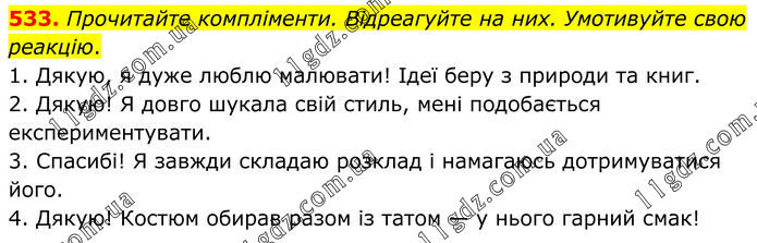 Прочитайте компліменти. Відреагуйте на них. Умотивуйте свою реакцію. 1. Дякую, я дуже люблю малювати! Ідеї беру з природи та книг. 2. Дякую! Я довго шукала свій стиль, мені подобається експериментувати. 3. Спасибі! Я завжди складаю розклад і намагаюсь дотримуватися його. 4. Дякую! Костюм обирав разом із татом — у нього гарний смак!