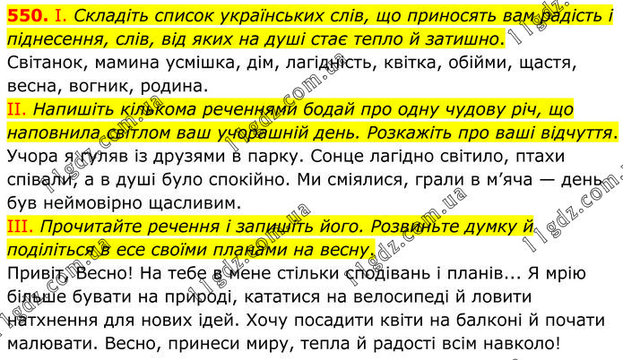 І. Складіть список українських слів, що приносять вам радість і піднесення, слів, від яких на душі стає тепло й затишно. Світанок, мамина усмішка, дім, лагідність, квітка, обійми, щастя, весна, вогник, родина. ІІ. Напишіть кількома реченнями бодай про одну чудову річ, що наповнила світлом ваш учорашній день. Розкажіть про ваші відчуття. Учора я гуляв із друзями в парку. Сонце лагідно світило, птахи співали, а в душі було спокійно. Ми сміялися, грали в м’яча — день був неймовірно щасливим. ІІІ. Прочитайте речення і запишіть його. Розвиньте думку й поділіться в есе своїми планами на весну. Привіт, Весно! На тебе в мене стільки сподівань і планів... Я мрію більше бувати на природі, кататися на велосипеді й ловити натхнення для нових ідей. Хочу посадити квіти на балконі й почати малювати. Весно, принеси миру, тепла й радості всім навколо!