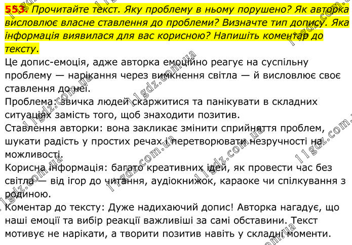 Прочитайте текст. Яку проблему в ньому порушено? Як авторка висловлює власне ставлення до проблеми? Визначте тип допису. Яка інформація виявилася для вас корисною? Напишіть коментар до тексту. Це допис-емоція, адже авторка емоційно реагує на суспільну проблему — нарікання через вимкнення світла — й висловлює своє ставлення до неї. Проблема: звичка людей скаржитися та панікувати в складних ситуаціях замість того, щоб знаходити позитив. Ставлення авторки: вона закликає змінити сприйняття проблем, шукати радість у простих речах і перетворювати незручності на можливості. Корисна інформація: багато креативних ідей, як провести час без світла — від ігор до читання, аудіокнижок, караоке чи спілкування з родиною. Коментар до тексту: Дуже надихаючий допис! Авторка нагадує, що наші емоції та вибір реакції важливіші за самі обставини. Текст мотивує не нарікати, а творити позитив навіть у складні моменти.